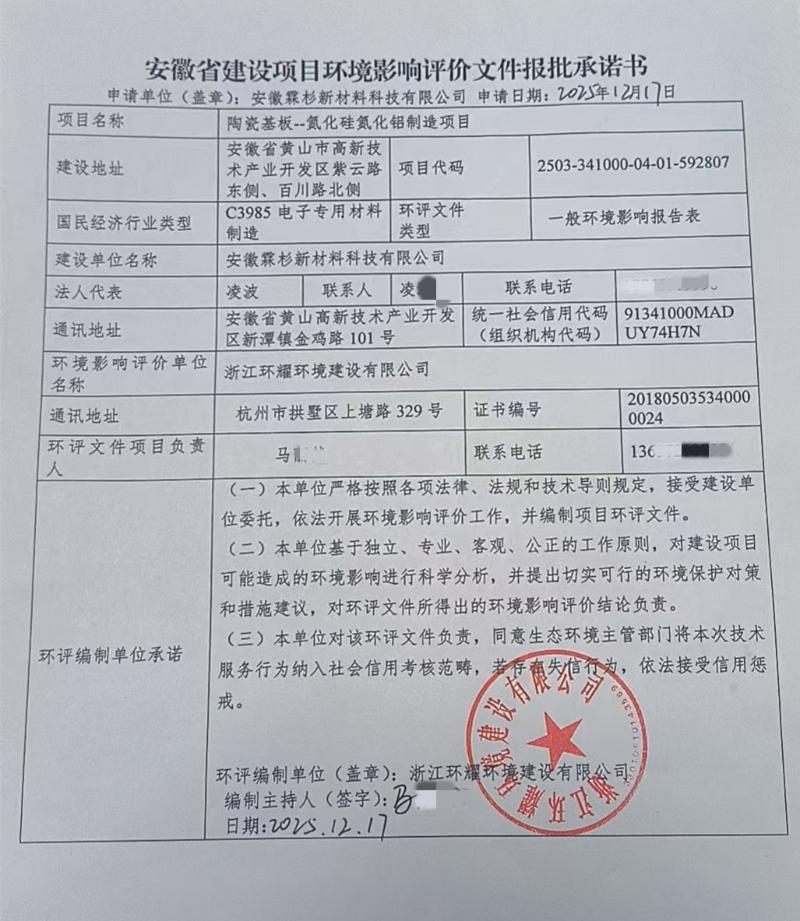 根据《安徽省生态环境厅关于强化生态环境保障和服务助力稳经济若干措施的通知》的要求,现将《安徽霖衫新材料科技有限公司陶瓷基板—氮化硅氮化铝制造项目》予以公示。